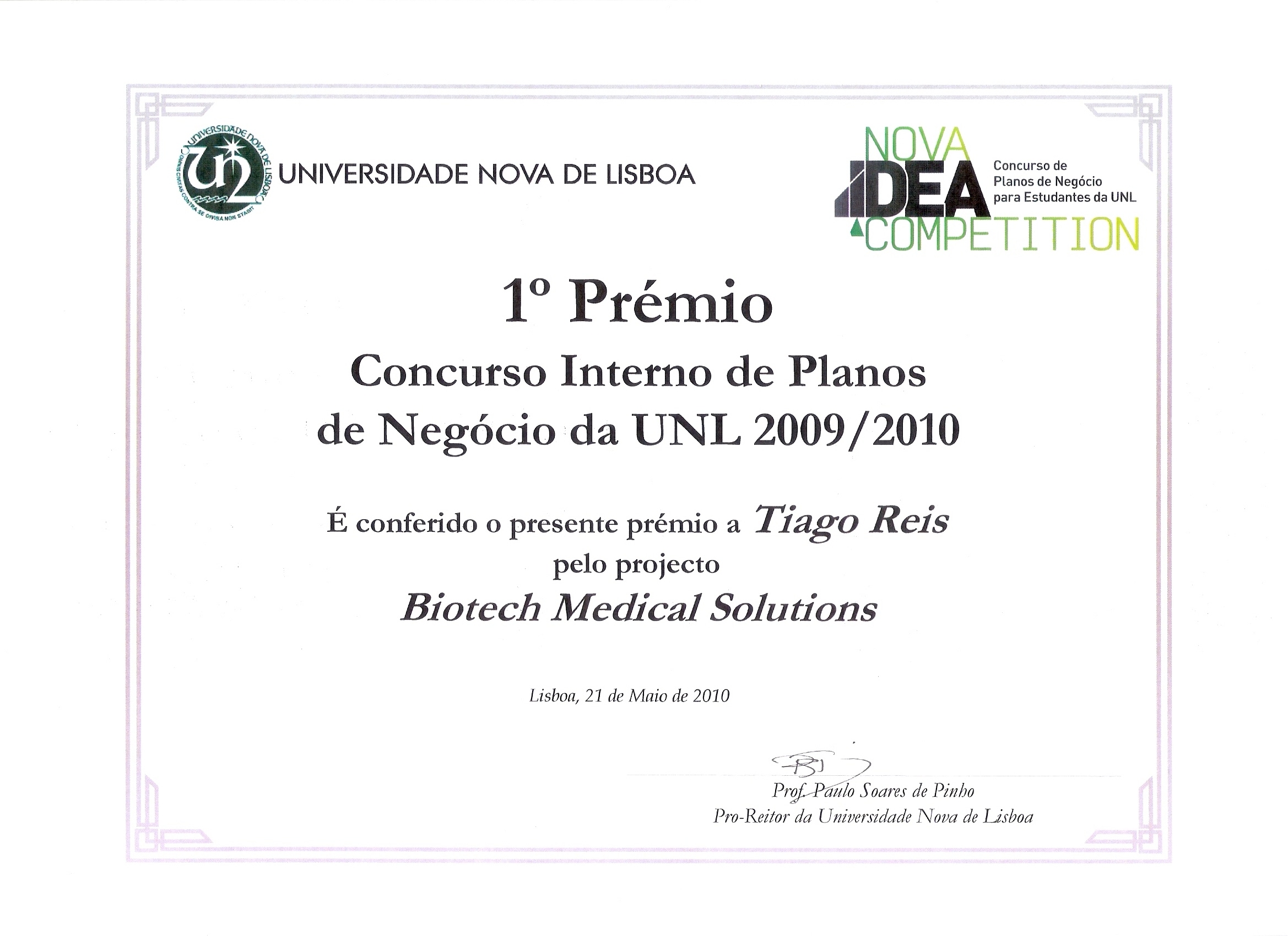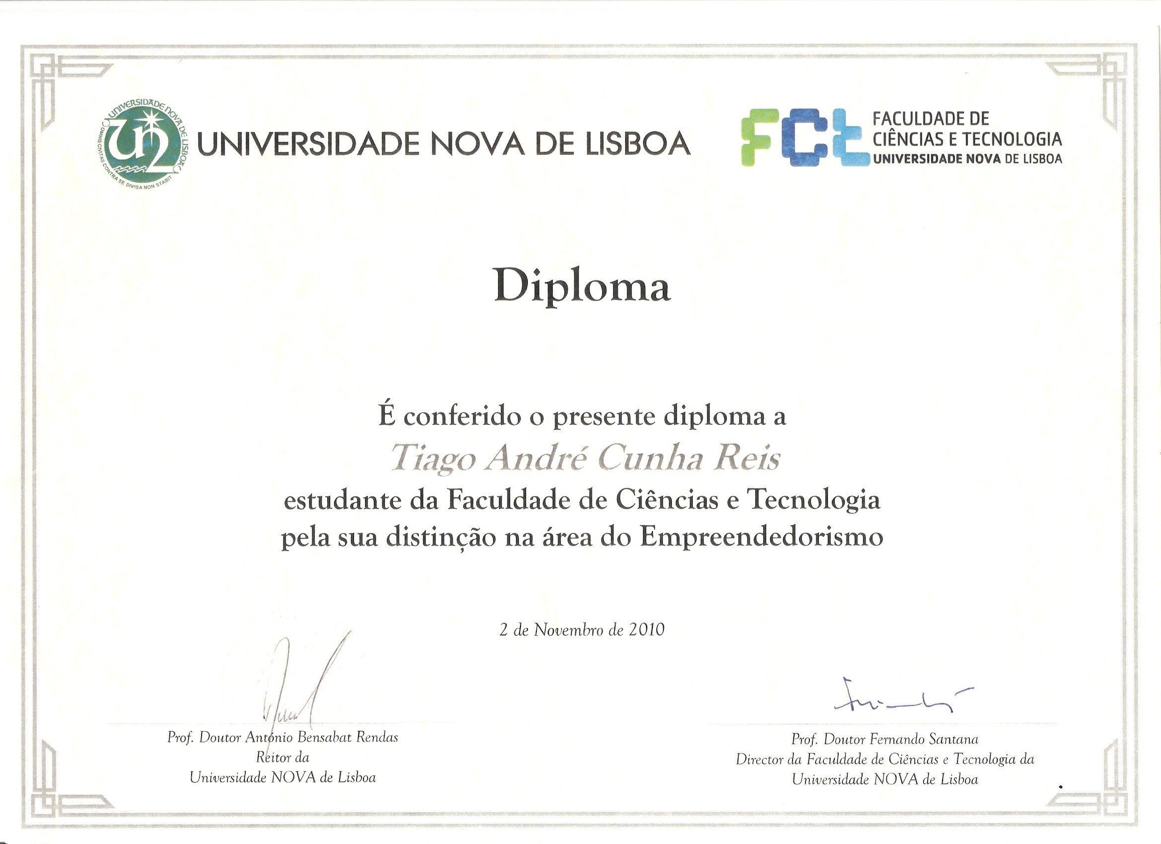 - Student Distinction 2010 in Entrepreneurship given by New University of Lisbon in Entrepreneurship (link)